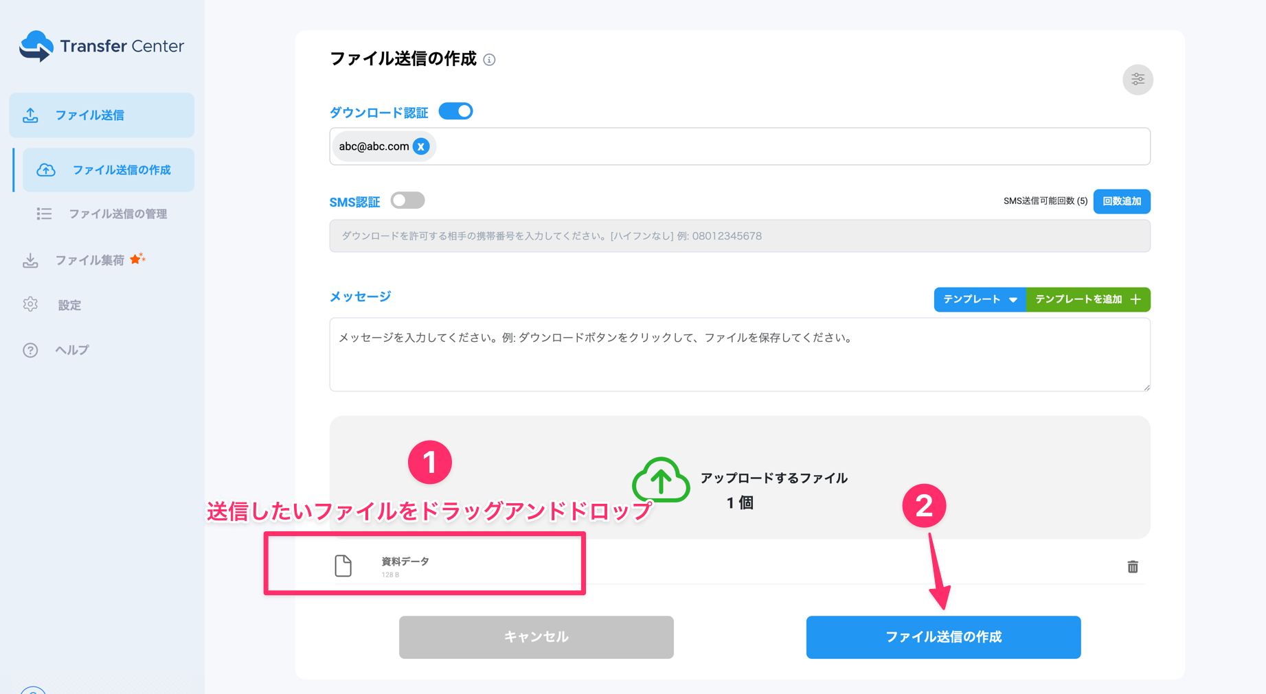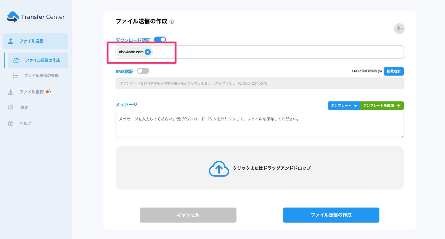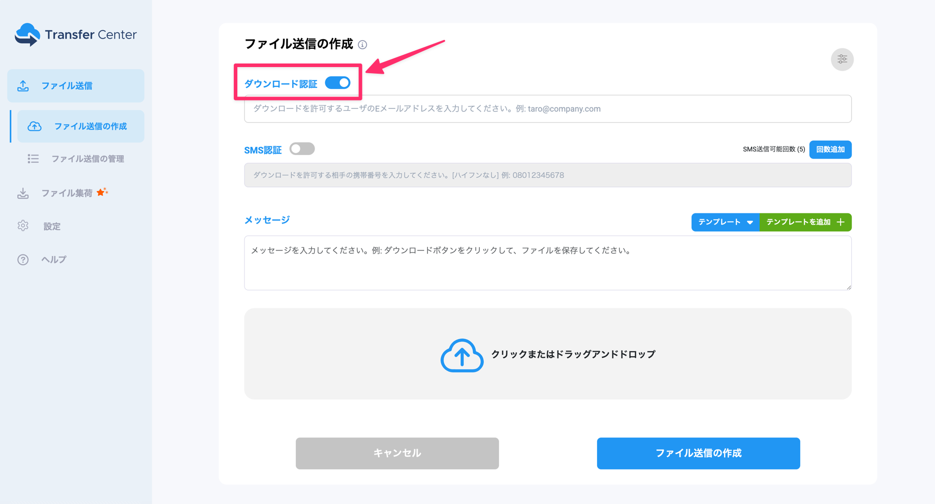 (1)Transfer Centerにログイン後、ファイル送信の作成画面で、ダウンロード認証をONにします。